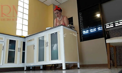 Nudist housekeeper Regina Noir cooking at the kitchen. Naked maid makes dumplings. Naked cooks. boulder-holder Trio